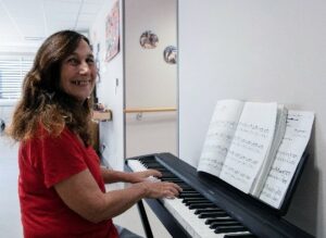 Dans sa jeunesse, Madame Bernardi était pianiste. Touchée par une déficience psychique accentuée par les événements de la vie, elle a intégré le FAM il y a quelques années. Si en temps normal, elle s’exprime avec difficulté et présente différents troubles psychiques, sa différence s’efface dès qu’elle s’installe au piano. Elle redevient la musicienne qu’elle était dans sa jeunesse. Avec d’autres résident·e·s et professionnel·le·s qui s’entrainent toute l’année durant l’atelier de musique proposé par le FAM, elle offrira aujourd’hui un concert à tous les spectateurs, mettant en valeur les talents de chaque musicien·ne.