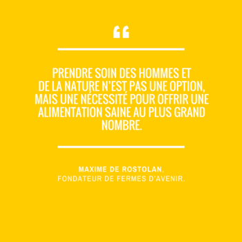 « J’ai découvert Maxime de Rostolan et l’association Fermes d’Avenir à travers un article dans le journal Le Monde, j’ai immédiatement été inspirée par les propositions concrètes développées pour actionner la transition agricole dans notre pays (financement, production, formation et influence sur les citoyens et sur les pouvoirs publics grâce à des propositions de lois) et surtout parce que l’association fédère la collectivité, rassemble des mondes qui a priori ne sont pas destinés à coopérer !