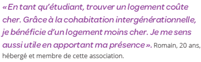 L’association développe ce projet intergénérationnel dans le Grand-Est en permettant ainsi à une personne âgée et à un jeune de se rencontrer et de s’entraider en vivant sous le même toit. L’une offre une chambre meublée, l’autre sa présence. Cette cohabitation est accompagnée par l’association qui assure la formalisation, le suivi et la médiation si nécessaire du binôme.