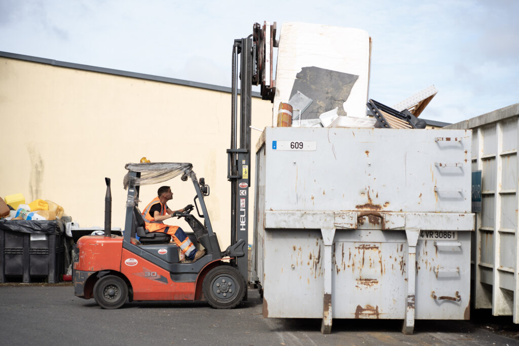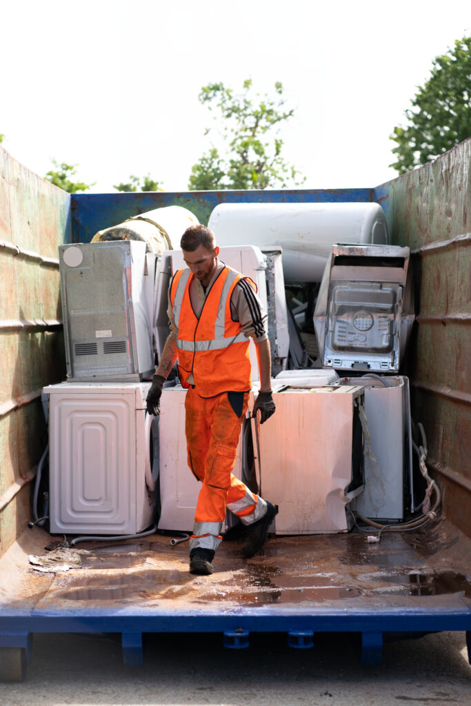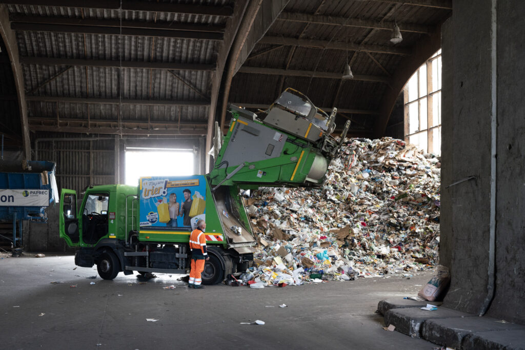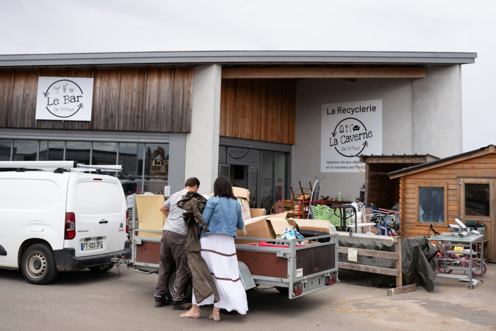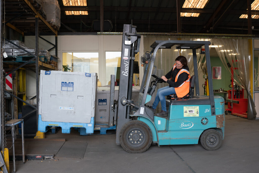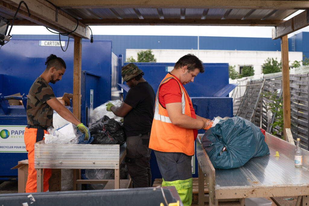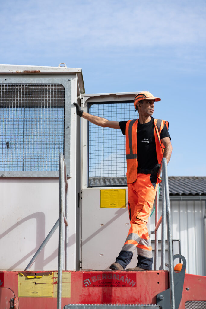 Il est 8h à La Riche, dans la proche banlieue de Tours. Trois camions sortent d’un hangar, embarquant chacun 3 personnes, toutes vêtues d’un gilet orange. Ils commencent leur ballet de va-et-vient, qui durera jusqu’à 16h.