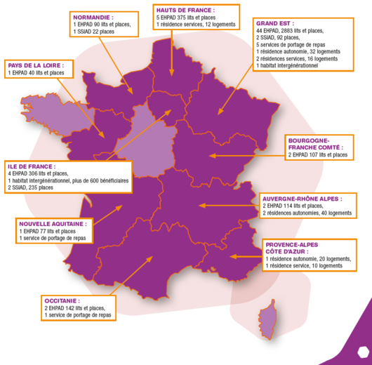 GROUPE SOS Seniors gère 77 établissements et services, dont 62 Etablissements d'hébergement pour personnes âgées dépendantes (EHPAD), soit plus de 4 500 places, 4 Résidences autonomie pour un total de 92 places, 4 Résidences services pour un total de 38 places, 5 Services de soins infirmiers à domicile (SSIAD) pour un total de 351 places, 7 activités de portage de repas et 2 associations d’habitat intergénérationnel avec plus de 600 bénéficiaires. Tous ces établissements favorisent la mixité sociale et proposent des prestations de qualité pour tous (tant au niveau de l'hôtellerie, des soins, de l'animation, de la blanchisserie que de la restauration).