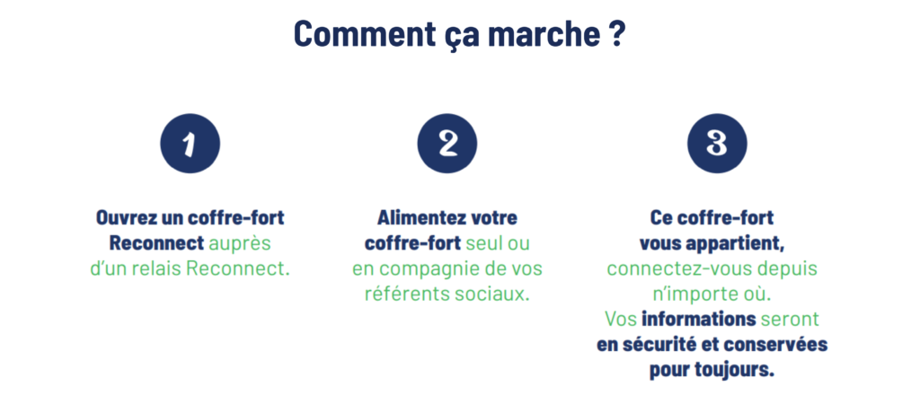 En effet les équipes des structures sociales partenaires de Reconnect (appelées relais Reconnect), sont formées à l’outil ainsi qu’à l’accompagnement des usager·e·s dans l’utilisation de leur coffre-fort. Aujourd’hui Reconnect c’est 450 structures partenaires, 3 000 professionnel·le·s et 27 000 bénéficiaires.