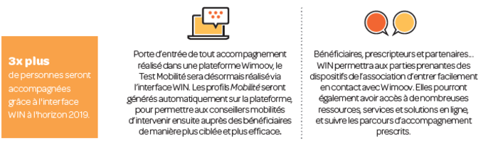 Cette année, avec le soutien des ministères du Travail et de l’Economie et des Finances, Wimoov proposera de nouvelles méthodes d’accompagnement pour lutter contre les inégalités en matière de mobilité. WIN, une interface numérique innovante, est une illustration de ces nouveaux types de dispositifs développés par Wimoov.