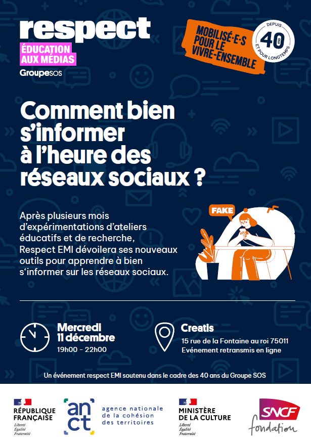 Après plusieurs mois d’expérimentations d’ateliers éducatifs et de travail avec des chercheur·euse·s, journalistes et expert·e·s de l’information et des réseaux sociaux, Respect – Education aux médias dévoilera son guide pédagogique “Bien s’informer à l’heure des réseaux sociaux” lors d’un événement le 11 décembre à Paris. Cet événement marquera également le lancement de webinaires grand public et d’un “Serious Game” accessible à toutes et tous. L’ambition de ces nouveaux outils : donner à chacun·e les clefs pour bien s’informer sur les réseaux sociaux.