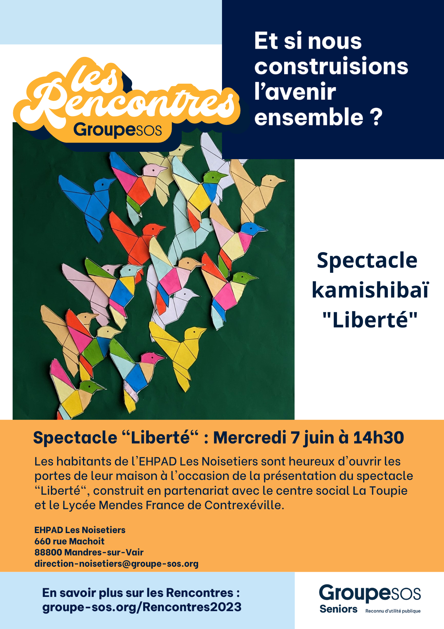 l’EHPAD Les Noisetiers sont heureux de vous inviter mercredi 7 juin 2023 à 14h30, pour la présentation du spectacle « Liberté », construit en partenariat avec le centre social La Toupie et le Lycée Professionnel Mendes France de Contrexéville.