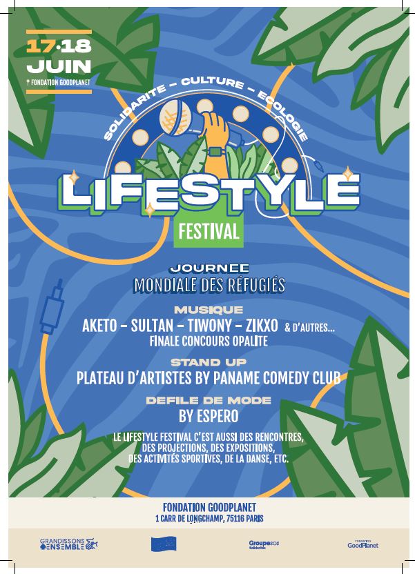 Les 17 et 18 juin 2023, à l’occasion de la Journée mondiale des réfugié·e·s, la Fondation GoodPlanet, Grandissons Ensemble, France terre d’asile et le Groupe SOS Solidarités organisent le LIFESTYLE FESTIVAL: deux jours de partage à la Fondation GoodPlanet (Domaine de Longchamp – Bois de Boulogne) pour promouvoir un mode de vie qui valorise la solidarité, la convivialité ee l’ouverture culturelle.