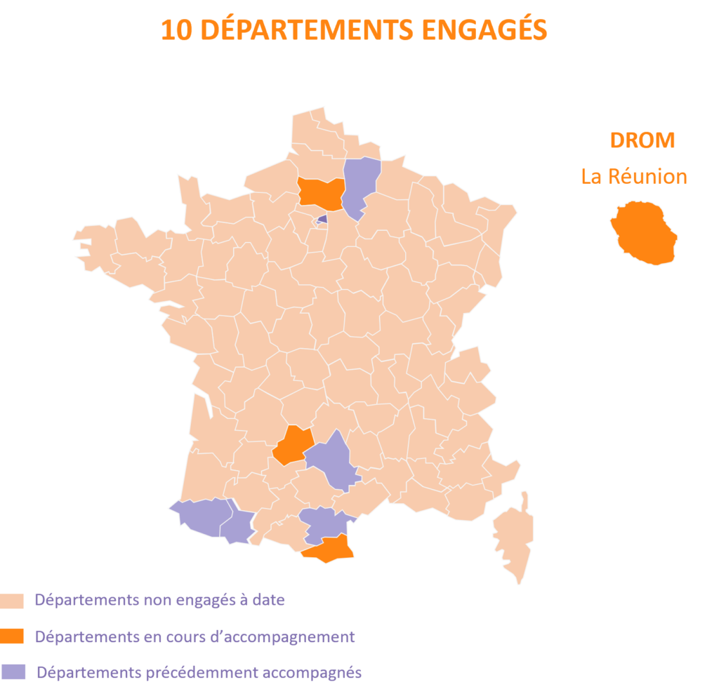 De 2021 à 2024, 10 départements volontaires ont bénéficié de cet accompagnement : Aisne, Aude, Aveyron, Lot, Oise, Pyrénées-Atlantiques, Hautes-Pyrénées, Pyrénées-Orientales, Seine-Saint-Denis, La Réunion.