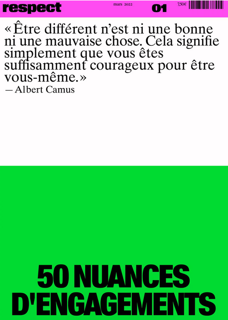 respect est le magazine qui raconte celles et ceux qui s’engagent pour le respect des différences, de l’humain et de la planète. Magazine trimestriel de 96 pages, respect s’incarne par des visages, débats, dossiers thématiques mais surtout des personnalités engagées qui portent haut les couleurs du respect des autres et de la différence.